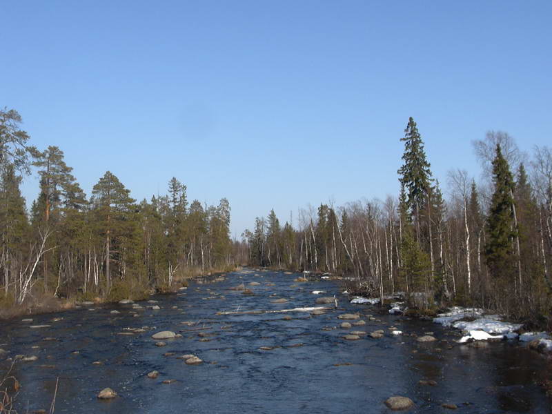 колено. Через 6 км переезжаем ручей, вытекающий из озера. Вода бурого цвета, но